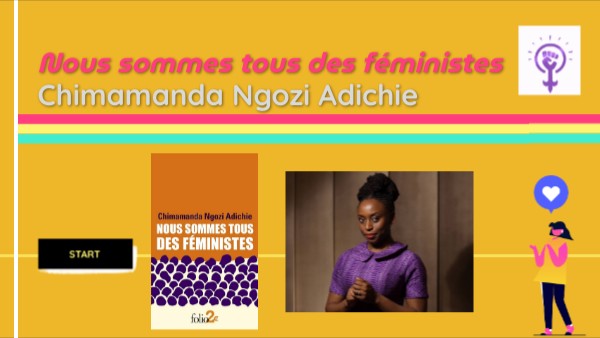 Un ami lui dit, à la suite d’une discussion, qu’elle est féministe et elle sent bien que cela est lancé comme une insulte. Ainsi commence son essai « Nous sommes tous des féministes ». Elle détaille ensuite plusieurs expériences, plusieurs moments de sa vie où on a tenté de nombreuses fois de lui expliquer qu’être féministe ce n’est pas quelque chose de valorisant, bien au contraire. Elle met en avant que les hommes aussi ont un intérêt à lutter pour le féminisme car ils sont éduqués selon les stéréotypes ancrés
