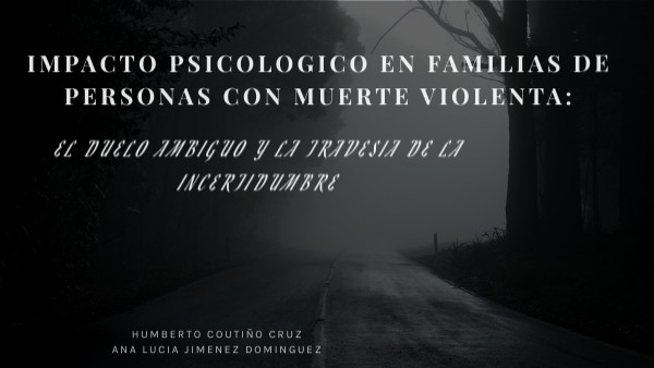 García, L., Rosa, I. y Suaréz, M. (2007). LA PÉRDIDA AMBIGUA: UNA PROLONGADA AFLICCIÓN DE LA FAMILIA Psicología y Ciencia Social ,vol.9 (2),32-41 Asociación Americana de Psiquiatría, Manual diagnostico y estadistico de los trastornos mentales, Arlington, VA, Asociación Americana de Psiquiatría, 2013 Enciclopedia juridica (2020). Homicidio. http://www.enciclopedia-juridica.com/d/homicidio/homicidio.htm Agencia digital del estado de México [ADEM]. (2024) Trata de Personas y Secuestro. https://ceavem.edomex.gob.mx/tata_personas Instituto Nacional de Estadística y Geografía (INEGI). (2010). Defunciones por accidentes. https://iieg.gob.mx/contenido/PoblacionVivienda/libros/LibroDiezproblemas/Capitulo4.pdf Nizama Valladolid M. Suicidio. Revista Peruana de Epidemiologia 2011; 15(2): 1-5. https://www.safetylit.org/citations/index.php?fuseaction=citations.viewdetails&citationIds[]=citjournalarticle_815919_38 REAL ACADEMIA ESPAÑOLA: Diccionario de la lengua española, 23.ª ed., [versión 23.7 en línea]. <https://dle.rae.es> [2024]. Secretaría de Gobernación. México: CENAPRED. https://www1.cenapred.unam.mx/DIR_INSTRUMENTACION_COMPUTO/Guia%20Handbook_WEB.PDF Bedoya Valderrama, L. (2019). Modelo de evaluación casic. https://repositorio.konradlorenz.edu.co/handle/001/1002 American Psychological Association. (2012). El duelo: Cómo sobrellevar la muerte de un ser querido. https://www.apa.org/topics/families/duelo.