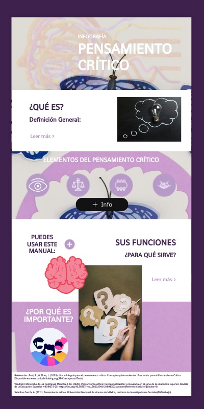 Referencias: Paul, R., & Elder, L. (2003). Una mini-guía para el pensamiento crítico: Conceptos y herramientas. Fundación para el Pensamiento Crítico. Disponible en www.criticalthinking.org(SP-ConceptsandTools). Vendrell i Morancho, M., & Rodríguez Mantilla, J. M. (2020). Pensamiento crítico: Conceptualización y relevancia en el seno de la educación superior. Revista de la Educación Superior, 49(194), 9-25. https://doi.org/10.36857/resu.2020.194.1121​:contentReference[oaicite:1]{index=1}. Saladino García, A. (2012). Pensamiento crítico. Universidad Nacional Autónoma de México, Instituto de Investigaciones Sociales(506trabajo).