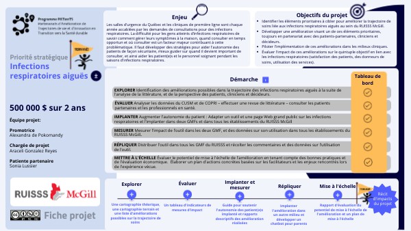 - Identifier les éléments prioritaires à cibler pour améliorer la trajectoire de soins liée aux infections respiratoires aiguës au sein du RUISSS McGill.