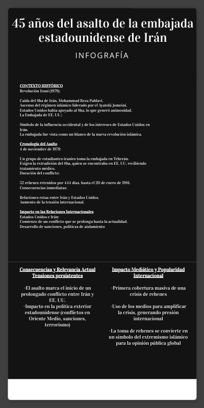 CONTEXTO HISTÓRICORevolución Iraní (1979): Caída del Sha de Irán, Mohammad Reza Pahlavi. Ascenso del régimen islámico liderado por el Ayatolá Jomeini. Estados Unidos había apoyado al Sha, lo que generó animosidad. La Embajada de EE. UU.: Símbolo de la influencia occidental y de los intereses de Estados Unidos en Irán. La embajada fue vista como un blanco de la nueva revolución islámica. Cronología del Asalto 4 de noviembre de 1979: Un grupo de estudiantes iraníes toma la embajada en Teherán. Exigen la extradición del Sha, quien se encontraba en EE. UU. recibiendo tratamiento médico. Duración del conflicto: 52 rehenes retenidos por 444 días, hasta el 20 de enero de 1981. Consecuencias inmediatas: Relaciones rotas entre Irán y Estados Unidos. Aumento de la tensión internacional. Impacto en las Relaciones Internacionales Estados Unidos e Irán: Comienzo de un conflicto que se prolonga hasta la actualidad. Desarrollo de sanciones, políticas de aislamiento
