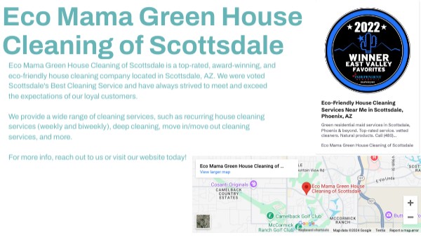 Eco Mama Green House Cleaning of Scottsdale is a top-rated, award-winning, and eco-friendly house cleaning company located in Scottsdale, AZ. We were voted Scottsdale's Best Cleaning Service and have always strived to meet and exceed the expectations of our loyal customers. We provide a wide range of cleaning services, such as recurring house cleaning services (weekly and biweekly), deep cleaning, move in/move out cleaning services, and more. For more info, reach out to us or visit our website today!