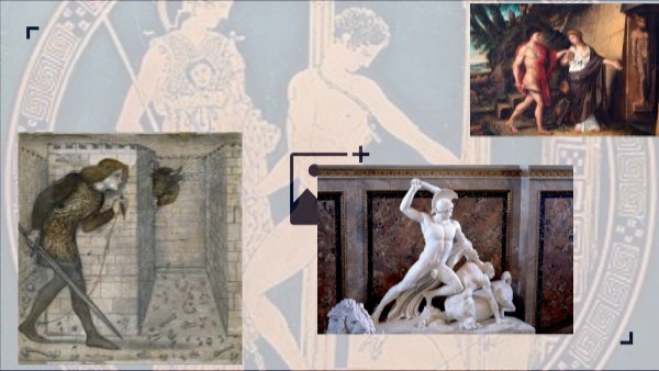 En este cuadro podemos ver como Teseo encuentra a la bestia y como en una mano se ve el hilo que usara para volver a la entrada y en la otra la espada que usara para matarlo sin piedad. este cuadro se titula: Theseus and the Minotaur in the Labyrinth escrito por Edward Burne-Jones.