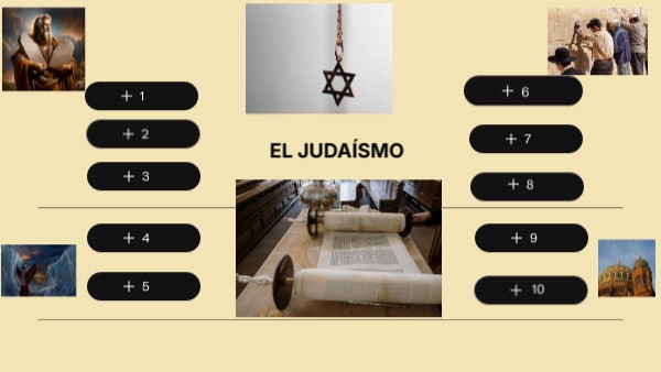 PERSONAJESAbraham: Padre del monoteísmo y primer patriarca, inicia el pacto con Dios que define al pueblo judío.Moisés: Líder y profeta que libera a Israel de Egipto y recibe la Torá en el Sinaí. David: Rey guerrero y poeta, de cuyo linaje se espera al Mesías según la tradición. Salomón: Rey sabio que construye el Primer Templo, símbolo central del judaísmo. Maimónides: Filósofo y erudito medieval cuyas obras siguen siendo esenciales para el pensamiento judío.