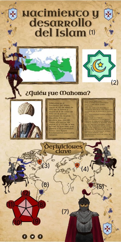 570: nace Mahoma. 575: cuando Mahoma tenía cinco o seis años quedo huérfano. 595: Se casó con Khadija, le nacieron seis hijos, dos hijos que murieron en la infancia y cuatro hijas. 610: Muhammad recibe primera revelación. 622: Viaje a la Meca. 622 Muhammad y sus pocos cientos de seguidores dejaron La Meca y viajaron a Yathrib, que pronto se hizo conocido como Medina, la ciudad del profeta. 630-632 Mahoma volvió a vivir en Medina. En marzo de 632, regresó a La Meca por última vez para realizar una peregrinación, el 8 de junio de 632, murió.
