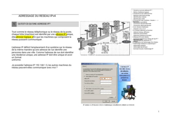 1 Qu’est-ce qu’une adresse IP ?- Notion d’adresse logique2 Anatomie d’une adresse IPv4 - Notation décimale pointée - Identificateur réseau - Identificateur hôte3 Conversion des nombres : binaire < - - > - Numération pondérée - Conversion binaire-décimale - Conversion décimale-binaire4 Les classes d’adresses - Classes A, B, C, D, E5 A chaque adresse sa fonction - Adresse réseau, diffusion - Adresses particulières - Adresses publique et privées6 Masque de sous-réseau - Comment extraire l’@ réseau de l’@ IP ?7 Qui attribue les adresses IP ?8 Préparation de l’adressage d’un réseau9 Adressage statique ou dynamique ? - Adressage statique - Adressage dynamique - Exemple de plan d’adressage IP