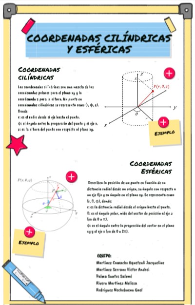 Las coordenadas cilíndricas son una mezcla de las coordenadas polares para el plano xy y la coordenada z para la altura. Un punto en coordenadas cilíndricas se representa como (r, ϕ, z). Donde:r: es el radio desde el eje hasta el punto. ϕ: el ángulo entre la proyección del punto y el eje x. z: es la altura del punto con respecto al plano xy.