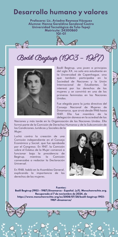 Fuentes:Bodil Begtrup (1903 – 1987) Dinamarca - Español. (s/f). Menschenrechte.org. Recuperado el 7 de noviembre de 2024, de https://www.menschenrechte.org/es/2008/07/28/bodil-begtrup-1903-1987-dinamarca/