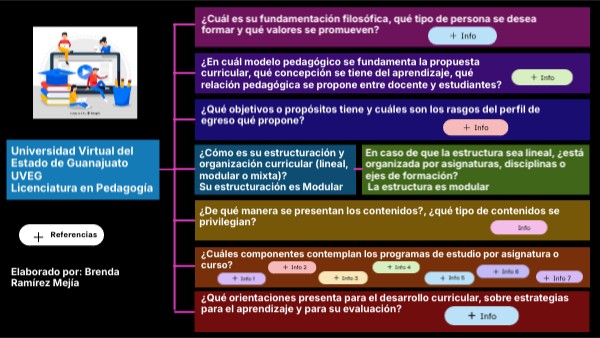 La universidad cuenta con Licenciaturas e ingenierías, en este caso nos enfocaremos en la Licenciatura en Pedagogía. Módulos (materias) del programa La Licenciatura en Pedagogía consta de 41 materias y cada una tiene una duración de 4 semanas. El plan de estudios está distribuido en 8 niveles. Cada nivel está compuesto por módulos, una materia optativa sello y/o materias de especialización (UVEG, s.f).