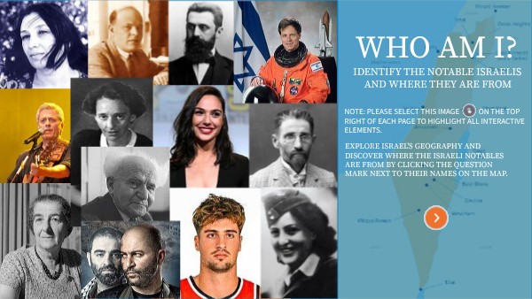 explore Israel's geography and discover where the Israeli notables are from by clicking the question mark next to their names on the map.