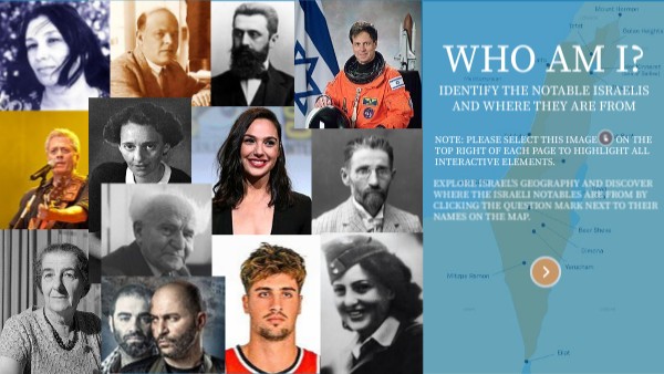 Explore Israel's geography and discover where the Israeli notables are from by clicking the question mark next to their names on the map.