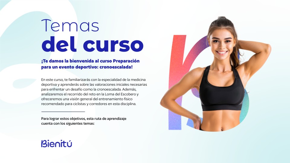 En este curso, te familiarizarás con la especialidad de la medicina deportiva y aprenderás sobre las valoraciones iniciales necesarias para enfrentar un desafío como la cronoescalada. Además, analizaremos el recorrido del reto en la Loma del Escobero y ofreceremos una visión general del entrenamiento físico recomendado para ciclistas y corredores en esta disciplina.