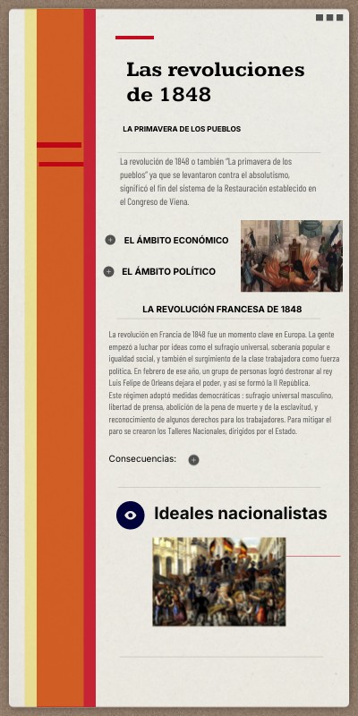La revolución de 1848 o también “La primavera de los pueblos” ya que se levantaron contra el absolutismo, significó el fin del sistema de la Restauración establecido en el Congreso de Viena.