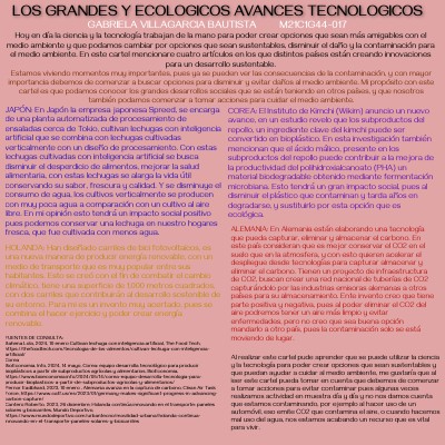 FUENTES DE CONSULTA: Bahena Lola, 2024, 10 enero Cultivan lechuga con inteligencia artificial, The Food Tech, https://thefoodtech.com/tecnologia-de-los-alimentos/cultivan-lechuga-con-inteligencia-artificial/ Corea BioEconomia. Info, 2024, 14 mayo, Corea: equipo desarrolla tecnológico para producir bioplásticos a partir de subproductos agrícolas y alimentarios, BioEconomia, https://www.bioeconomia.info/2024/05/14/corea-equipo-desarrolla-tecnologia-para-producir-bioplasticos-a-partir-de-subproductos-agricolas-y-alimentarios/ Pernor Eadbhard, 2023, 10 enero , Alemania avanza en la captura de carbono, Clean Air Task Force, https://www.catf.us/es/2023/01/germany-makes-significant-progress-in-advancing-carbon-capture/ Cantero Roberto, 2023, 26 diciembre, Holanda continúa innovando en el transporte: paneles solares y bicicarriles, Mundo Deportivo, https://www.mundodeportivo.com/urbantecno/movilidad-urbana/holanda-continua-innovando-en-el-transporte-paneles-solares-y-bicicarriles