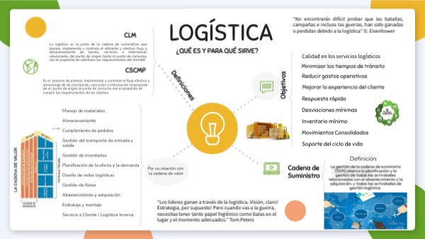 La logística es la parte de la cadena de suministros que planea, implementa y controla el eficiente y efectivo flujo y almacenamiento de bienes, servicios e información relacionada, del punto de origen hasta el punto de consumo, con el propósito de satisfacer los requerimientos del clienteE