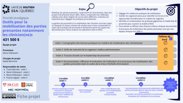 - Documenter et diffuser dans d’autres milieux cliniques de proximité le processus de mobilisation des parties prenantes suivi par une équipe clinique d'un GMF-U.