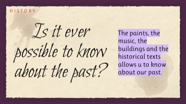 The paints, the music, the buildings and the historical texts allows u to know about our past.