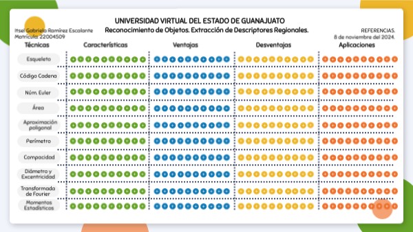 Kumar, K. (2021). Pattern Classification. [Archivo PDF]. https://erkundanec.github.io/Files/Teaching/PatternClassification_Slides/Lec02_FeatureExtraction.pdfUniversidad de Sevilla. (s.f.). Tema 6: Descriptores de la imagen y reconocimiento. [Archivo PDF]. https://asignatura.us.es/imagendigital/Tema6_Descripcion_reconocimiento.pdfUniversidad de Sevilla. (s.f.). Tema 6: Descriptores topológicos, geométricos y estadísticos de las imágenes digitales. [Archivo PDF]. https://grupo.us.es/gtocoma/pid/tema6.pdfUniversidad Militar Nueva Granada. (2017). Descriptores espacio-frecuencia para identificación automática de patrones de textura en productos textiles utilizando aprendizaje supervisado. https://www.redalyc.org/journal/911/91158463004/html/Universidad Nacional de Rosario. (s.f.). Procesamiento Digital de Imágenes. Representación y Descriptores. [Archivo PDF]. https://www.fceia.unr.edu.ar/dip/Representacion_Descriptores.pdfUniversidad Tecnológica de Pereira. (2019). Evaluación de descriptores para la detección automática de fallas en fabricación utilizando máquinas de soporte vectorial. https://www.redalyc.org/journal/849/84961238003/html/