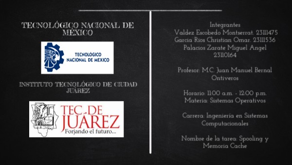 Integrantes Valdez Escobedo Montserrat. 23111475 Garcia Rios Christian Omar. 23111536 Palacios Zarate Miguel Angel 23110164 Profesor: M.C. Juan Manuel Bernal Ontiveros Horario: 11:00 a.m. - 12:00 p.m. Materia: Sistemas Operativos Carrera: Ingeniería en Sistemas Computacionales Nombre de la tarea: Spooling y Memoria Cache