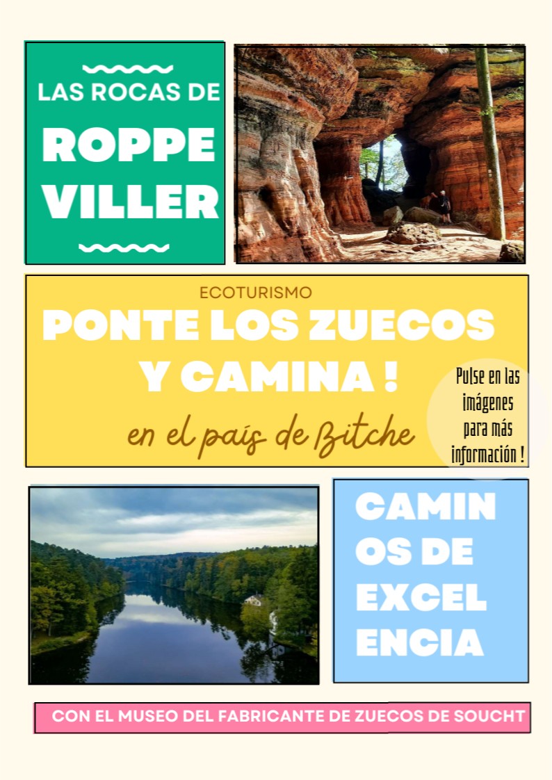 - Uno de estos senderos es el de «tras las huellas de los zuecos», con sus numerosos descubrimientos: rocas, cuevas y magníficas vistas sobre el pueblo de Soucht. Pasa por el museo del zueco, que explica la historia y la fabricación de los zuecos.
