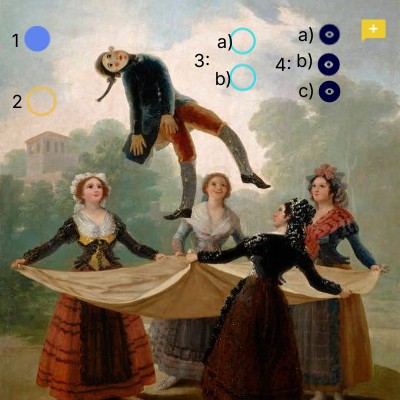 b. Formal:La composición de "El Pelele" se organiza de manera que el espectador es guiado a través de una serie de interacciones entre personajes. En el primer plano, se observa un grupo de personas alrededor de un pelele, que es un muñeco hecho de paja, en un contexto festivo. La disposición de los personajes sugiere una dinámica social y un juego de miradas que atrapa la atención, enfatizando la interacción y la manera en que todos parecen participar en la escena.Goya utiliza una paleta de colores vibrantes y contrastados. Los tonos cálidos predominan en las vestimentas de los personajes. Los colores predominantes, como el amarillo, el rojo y el verde, se combinan de manera que resaltan la alegría y la festividad del momento. Sin embargo, también se perciben sombras más neutras y apagadas, creando un contraste que sugiere las tensiones subyacentes y las críticas sociales presentes. Goya logra un manejo sutil de la luz, que ilumina los rostros de los personajes mostrando la alegría y la emoción en sus expresiones. Sin embargo, las sombras también juegan un papel importante, acentuando la profundidad y el volumen de las figuras.