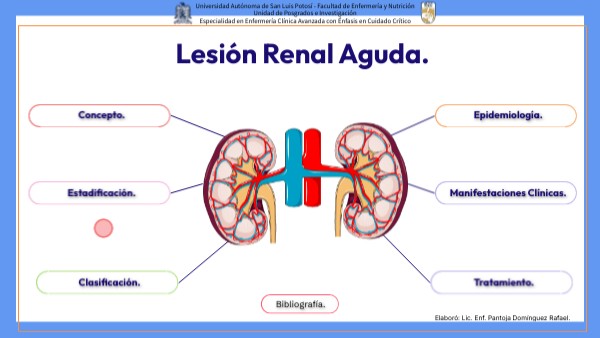 La lesión renal aguda (LRA) o Acute Kidney Injury (AKI), se define como el descenso abrupto de la función renal manifestada con la disminución de la tasa de filtrado glomerular (TFG), produciendo alteraciones en el equilibrio hídrico-electrolítico y ácido-base (GPC, 2024).