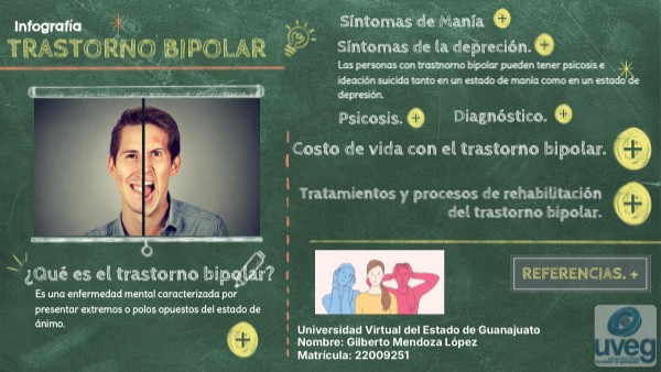 García, O. (s.f). Personalidad, afectividad, y psicomotricidad. En Psicopatología del adulto y el adulto mayor. [Módulo en línea]. Universidad Virtual del Estado de Guanajuato.https://avalicmod19c.uveg.edu.mx/mod/scorm/player.php?a=3850¤torg=PAAM_L7_ORG&scoid=8207 Stanford Center for Health Education. (24 oct. 2023) Trastorno Bipolar: Síntomas, Diagnóstico y Tratamiento. [Vídeo] YouTube. https://www.youtube.com/watch?v=aO24QKR2N64 Mezza, M., (2013). TRASTORNO BIPOLAR: NUEVO CUADRO LÍQUIDO. UN RECORRIDO POR LAS REGLAS DISCURSIVAS DE LA CLASIFICACIÓN PSIQUIÁTRICA Y POR LOS CONDICIONANTES SOCIO-HISTÓRICOS DE NUESTRA ÉPOCA. Límite. Revista Interdisciplinaria de Filosofía y Psicología, 8(27),75-87. [Fecha de Consulta 9 de noviembre de 2024]. ISSN: 0718-1361. Recuperado de: https://www.redalyc.org/articulo.oa?id=83628140005