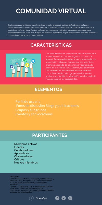 Bibliografía Comunidades Virtuales - Concepto, características y ejemplos. (s/f). Recuperado el 11 de noviembre de 2024, de https://concepto.de/comunidades-virtuales/ Ortega, C. (2019, mayo 29). Comunidades Virtuales: ¿Qué son y cómo usarlas? QuestionPro. https://www.questionpro.com/blog/es/comunidades-virtuales-de-investigacion/