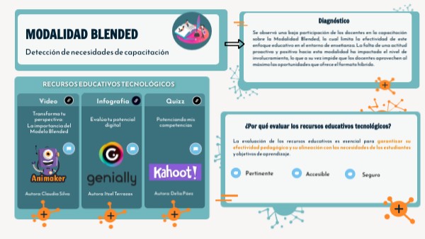 Tras análizar las entevistas realizadas a los docentes se identificaron tres necesidades de capacitación. Por lo cual se optó por desarrollar tres recursos eductivos tecnológicos para subsanarlas.