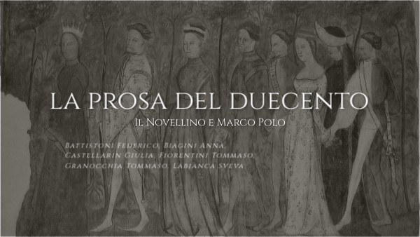 Contesto sociale: - i comuni: città-stato indipendenti ed autonome dai poteri feudali ed imperiali - la borghesia: una nuova classe sociale - rinascita del commercio - le città italiane diventano veri e propri centri di commercio - necessità della classe borghese di aumentare e approfondire le proprie conoscenze La prosa del Duecento: - opere didascaliche con l'obiettivo di educare - uso della lingua volgare: facile comprensione, pubblico più ampio Opere maggiori: - manuali retorici - epistole - trattatti morali - prediche religiose -prosa narrativa: la novellistica e Il Novellino, la cronaca di viaggio e Il Milione