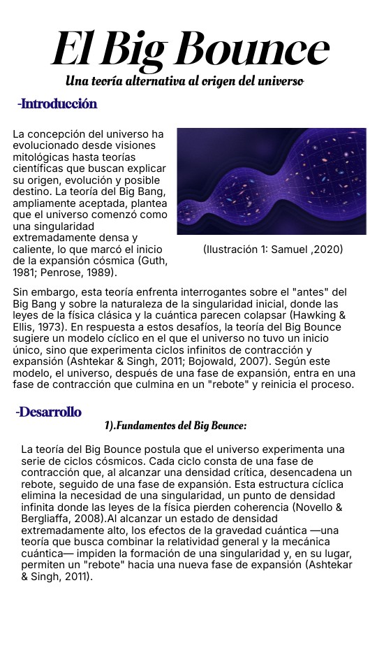 Sin embargo, esta teoría enfrenta interrogantes sobre el "antes" del Big Bang y sobre la naturaleza de la singularidad inicial, donde las leyes de la física clásica y la cuántica parecen colapsar (Hawking & Ellis, 1973). En respuesta a estos desafíos, la teoría del Big Bounce sugiere un modelo cíclico en el que el universo no tuvo un inicio único, sino que experimenta ciclos infinitos de contracción y expansión (Ashtekar & Singh, 2011; Bojowald, 2007). Según este modelo, el universo, después de una fase de expansión, entra en una fase de contracción que culmina en un "rebote" y reinicia el proceso.
