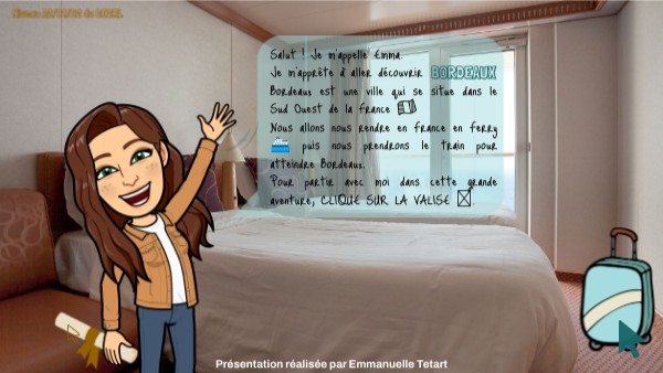 Salut ! Je m'appelle Emma. Je m'apprête à aller découvrir Bordeaux est une ville qui se situe dans le Sud Ouest de la France 🇫🇷 Nous allons nous rendre en France en Ferry ⛴️ puis nous prendrons le train pour atteindre Bordeaux. Pour partir avec moi dans cette grande aventure, CLIQUE SUR LA VALISE 🧳.