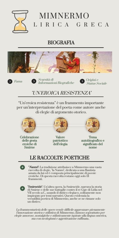 Mimnermo è noto principalmente per la sua fama quale poeta dell’amaro rimpianto della giovinezza, che però ha purtroppo messo in ombra le sue qualità di innovatore nel panorama della poesia greca arcaica