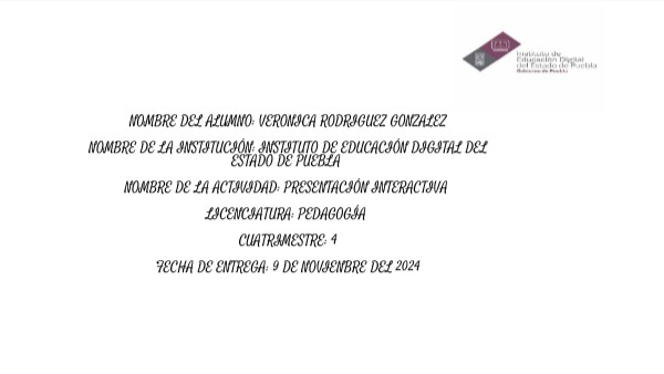 NOMBRE DEL ALUMNO: VERONICA RODRIGUEZ GONZALEZ NOMBRE DE LA INSTITUCIÓN: INSTITUTO DE EDUCACIÓN DIGITAL DEL ESTADO DE PUEBLA NOMBRE DE LA ACTIVIDAD: PRESENTACIÓN INTERACTIVA LICENCIATURA: PEDAGOGÍA CUATRIMESTRE: 4 FECHA DE ENTREGA: 9 DE NOVIENBRE DEL 2024