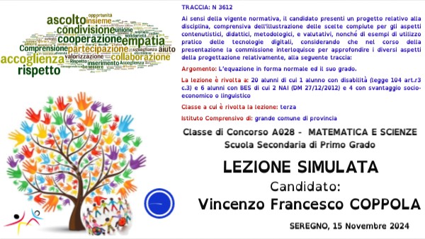 TRACCIA: N 3612 Ai sensi della vigente normativa, il candidato presenti un progetto relativo alla disciplina, comprensiva dell'illustrazione delle scelte compiute per gli aspetti contenutistici, didattici, metodologici, e valutativi, nonché di esempi di utilizzo pratico delle tecnologie digitali, considerando che nel corso della presentazione la commissione interloquisce per approfondire i diversi aspetti della progettazione relativamente, alla seguente traccia: Argomento: L’equazione in forma normale ed il suo grado. La lezione è rivolta a: 20 alunni di cui 1 alunno con disabilità (legge 104 art.r3 c.3) e 6 alunni con BES di cui 2 NAI (DM 27/12/2012) e 4 con svantaggio socio-economico o linguistico Classe a cui è rivolta la lezione: terza Istituto Comprensivo di: grande comune di provincia