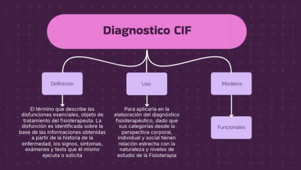 La CIF usa un sistema alfanumérico para codificar funciones y disfunciones del movimiento humano, útil en diagnóstico fisioterapéutico. "Función" se refiere a actividades realizadas para adaptarse al entorno, mientras que "disfunción" es el desequilibrio en el movimiento que limita la función. Las disfunciones se clasifican en cargas, asistencias y traductores. El análisis se basa en: