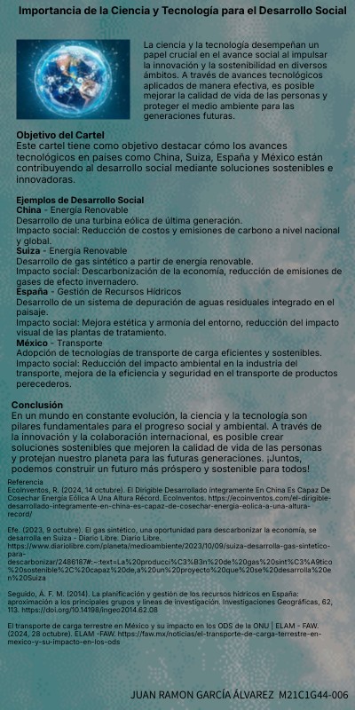 Este cartel tiene como objetivo destacar cómo los avances tecnológicos en países como China, Suiza, España y México están contribuyendo al desarrollo social mediante soluciones sostenibles e innovadoras.