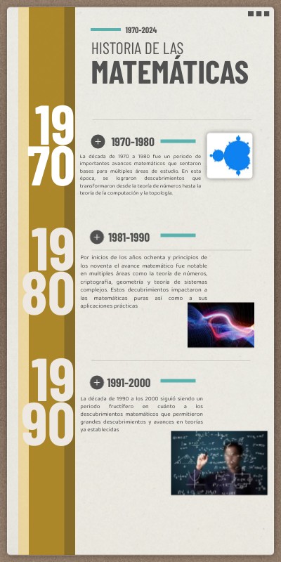 Por inicios de los años ochenta y principios de los noventa el avance matemático fue notable en multiples áreas como la teoría de números, criptografía, geometría y teoría de sistemas complejos. Estos decubrimientos impactaron a las matemáticas puras así como a sus aplicaciones prácticas