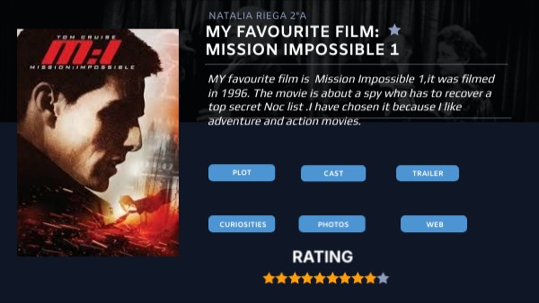 MY favourite film is Mission Impossible 1,it was filmed in 1996. The movie is about a spy who has to recover a top secret Noc list .I have chosen it because I like adventure and action movies.