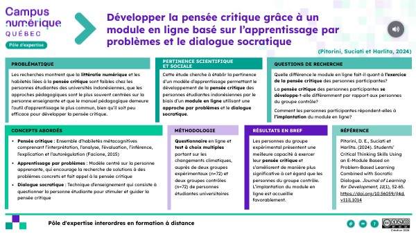 Pour citer ce document : Pôle d’expertise interordres en formation à distance. (2024). Développer la pensée critique grâce à un module en ligne basé sur l’apprentissage par problèmes et le dialogue socratique. [Fiche de lecture de Students’ Critical Thinking Skills Using an E-Module Based on Problem-Based Learning Combined with Socratic Dialogue | Journal of Learning for Development, par Pitorini, D. E., Suciati et Harlita, 2024]. Campus numérique Québec. Licence CC-BY-NC-SA https://view.genially.com/6732334480d5f919c4124985