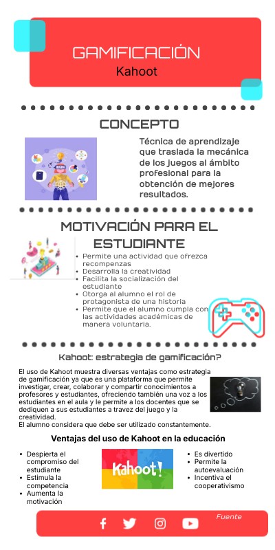 El uso de Kahoot muestra diversas ventajas como estrategia de gamificación ya que es una plataforma que permite investigar, crear, colaborar y compartir conocimientos a profesores y estudiantes, ofreciendo también una voz a los estudiantes en el aula y le permite a los docentes que se dediquen a sus estudiantes a travez del juego y la creatividad. El alumno considera que debe ser utilizado constantemente.
