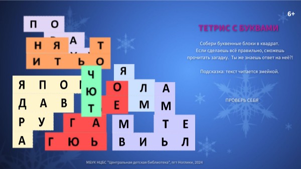 Собери буквенные блоки в квадрат. Если сделаешь всё правильно, сможешь прочитать загадку. Ты же знаешь ответ на неё?! Подсказка: текст читается змейкой.