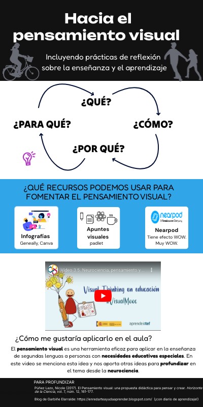 Mediante esta infografía me propongo incorporar y poner en práctica algunas de las ideas que se han propuesto en la unidad 5 para estimular el pensamiento visual y la reflexión como docente y aprendiz.