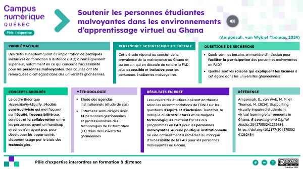 Pour citer ce document : Pôle d’expertise interordres en formation à distance. (2024). Soutenir les personnes étudiantes malvoyantes dans les environnements d’apprentissage virtuel au Ghana. [Fiche de lecture de Supporting visually impaired students in virtual learning environments in Ghana, par Amponsah, S., van Wyk, M. M. et Thomas, M., 2024]. Campus numérique Québec. Licence CC-BY-NC-SA https://view.genially.com/6733a0f788350a2a3f893fb6