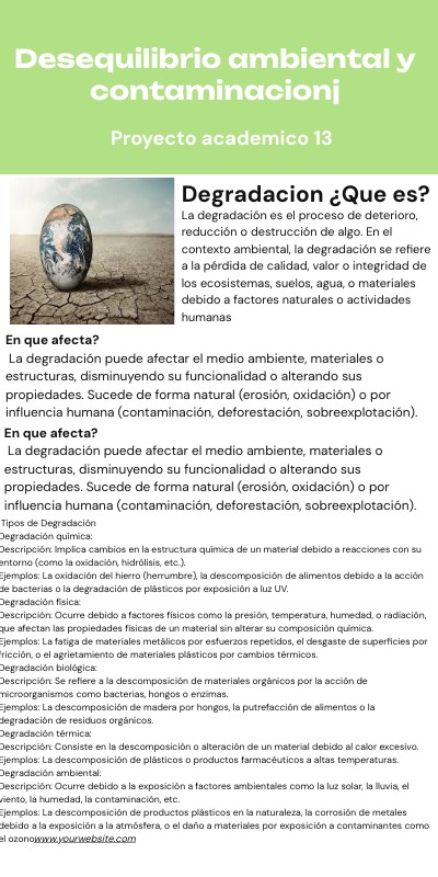 En que afecta? La degradación puede afectar el medio ambiente, materiales o estructuras, disminuyendo su funcionalidad o alterando sus propiedades. Sucede de forma natural (erosión, oxidación) o por influencia humana (contaminación, deforestación, sobreexplotación).