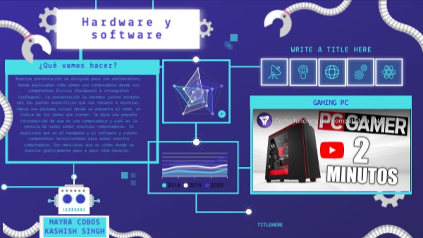 Nuestra presentación va dirigida para los adolescentes, donde explicamos cómo armar una computadora desde sus componentes físicos (hardware) e intangibles (software). La presentación la haremos juntas excepto por las partes específicas que nos tocaron a nosotras. Habrá una portada visual donde se presenta el tema, un índice de los temas que vienen. Se dará una pequeña introducción de que es una computadora y cuál es la ventaja de saber armar nuestras computadoras. Se explicará qué es el hardware y el software y cuáles componentes necesitaremos para armar nuestra computadora. Sin mencionar que un video donde se muestre gráficamente paso a paso cómo hacerlo.