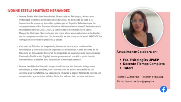 - Ivonne también ha liderado proyectos de formación docente, integrando tecnología y redes sociales, con la convicción de que la educación es un carisma que transforma. Su vocación la impulsa a seguir formando líderes con compromiso y principios sólidos, fiel a los valores del carisma salesiano.