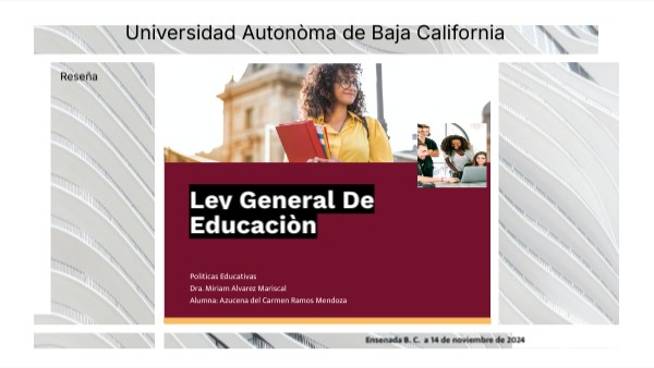 En el video realizado por Minerva Soberanes Cruz, acerca de la Ley General de Educaciòn, que està constituida por capìtulos y que estàn integrados por àrticulos. Se aborda temas relevantes como la Nueva Escuela Mexicana (NEM), y los articulos 3º, 31º, entre otros y como aborda los crìterios y fines de la Educaciòn en Mèxico, para que se cumplan como se establece en la Ley General de Educaciòn