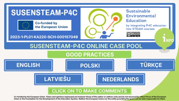 Welcome to the SUSENSTEAM-P4C Online Case Pool! This platform is designed to help educators access good practices and activities that integrate P4C (Philosophy for Children) with STEAM and Environmental Sustainability. ✅ STEP 1: Choose Your Language from the main page. ✅ STEP 2: Browse Good Practices: After selecting your language, you’ll see a list of project partners’ countries. Click on any title to explore its good practices. ✅ STEP 3: Understand the Buttons Project’s Website Button: Shows all project activities and results. Links to the SUSENSTEAM P4C E-learning Training Platform. Links to SUSENSTEAM P4C digital stories Main Page Button: Return to homepage. Go Back Arrow Button: Go to the previous screen. ✅ STEP 4: Explore Activities by clicking on the interactive items. In order to change subtitles on YouTube: Click the ⚙️ Settings icon, select Subtitles/CC. Then choose your language or use Auto-translate. This platform is part of the Erasmus+ project: “Sustainable Environmental Education by Integrating P4C Education into STEAM Courses” (SUSENSTEAM-P4C) Project Number: 2023-1-PL01-KA220-SCH-000157049 Co-funded by the European Union 🇪🇺