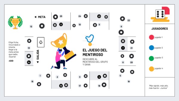 Elige ficha, tira el dado e intenta llegar a la meta antes que nadie. ¡Suerte!